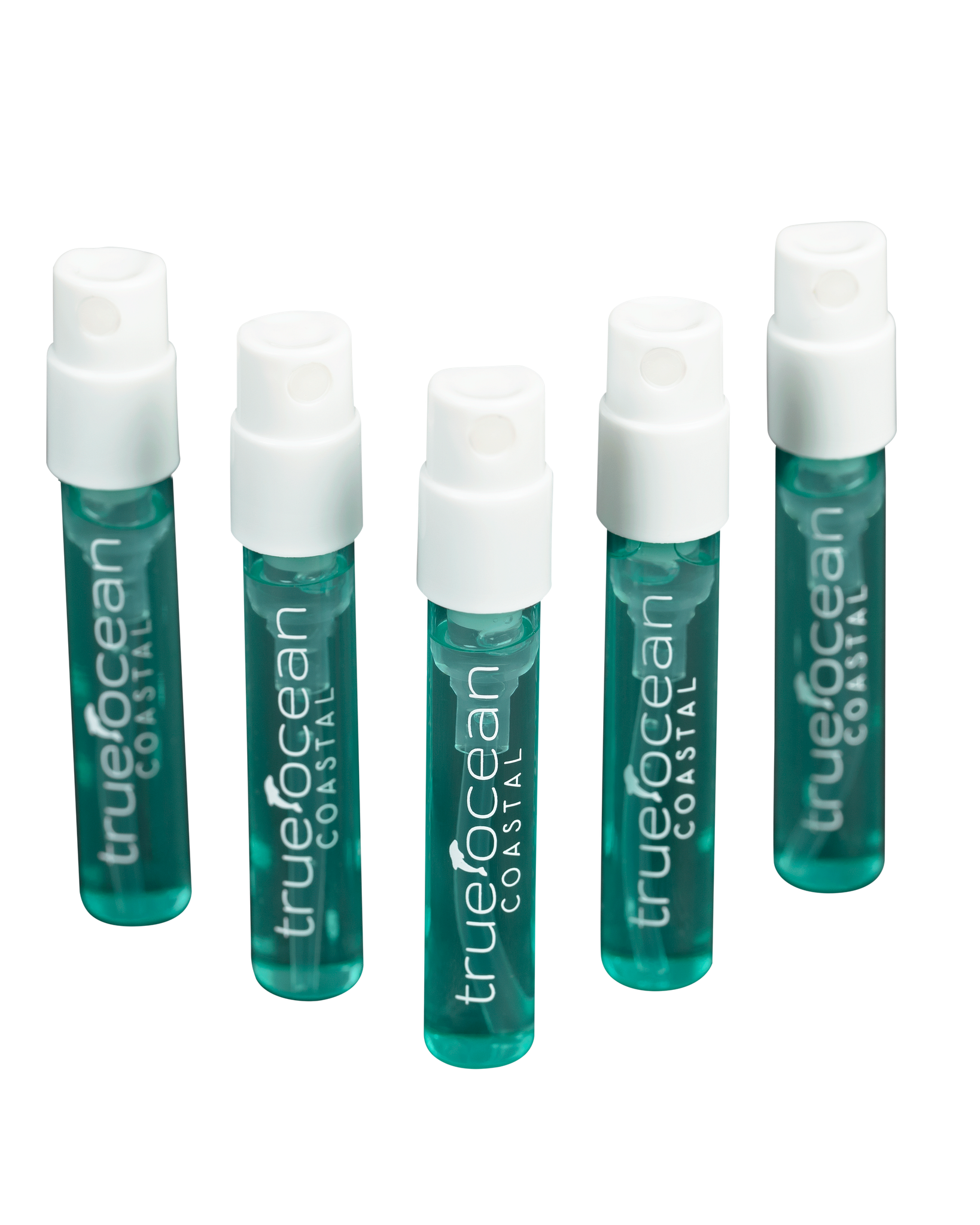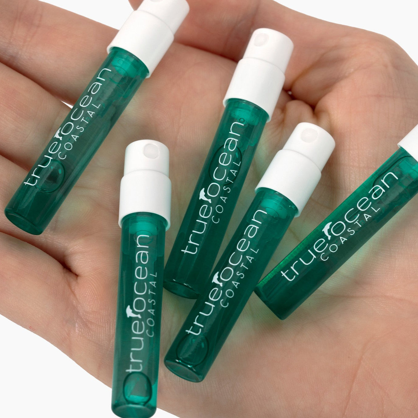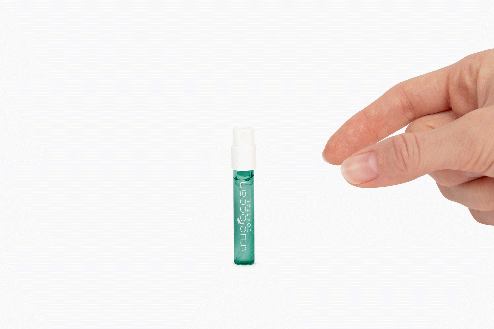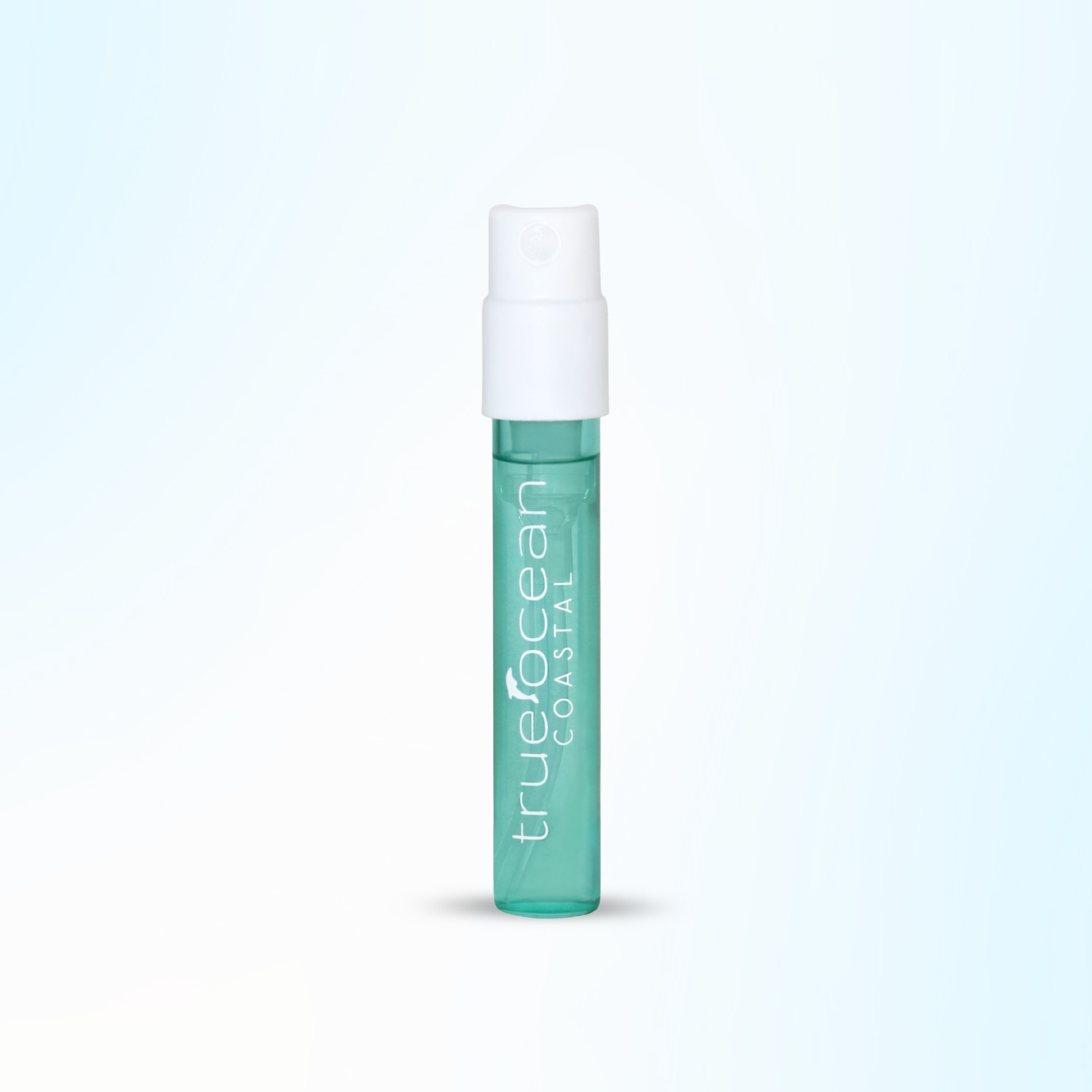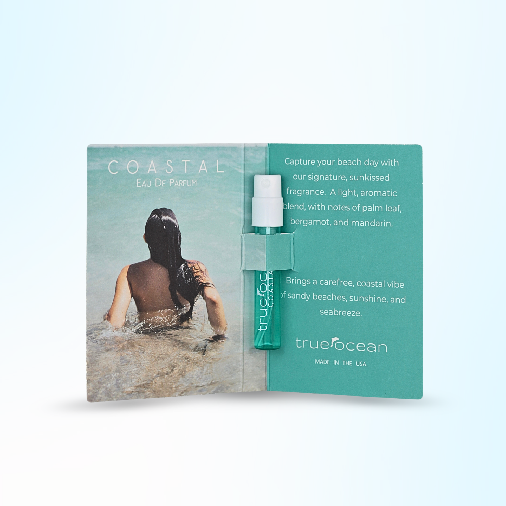 A 2mL vial containing a sample of True Ocean's Eau de Parfum, Coastal. Offering a light, aromatic blend, with notes of palm leaf, bergamot blossom, and mandarin. Brings a carefree vibe of sand, sunshine, and seabreeze.